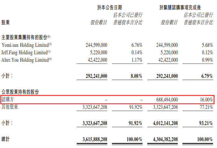 完成配售后,无极资本将成公司最大单一股东,持股持股16%;孙涛勇、方桐舒、游凤椿组成的主要股东集团持股比例,将从8.08%降至6.79%。